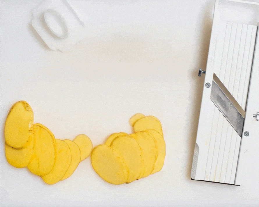 Care: Handwash [/accordions-break] [/banner-text-break] With this device’s wide range of use, you can mix and match crunchy vegetables with something tender for contrast. Or shave vegetables in varying thicknesses for different textures and flavor (fennel bulb is a great choice to try this with). Sliced thin enough, even tough root vegetables like turnips or beets are terrific in slaws and salads for textural contrast—and this mandoline transforms what would otherwise be arduous prep work into an easy task: Start by slicing vegetables into broad planks with the Benriner, then finish by hand, stacking and cutting crosswise with a chef’s knife for evenly diced vegetables that look professional every time. [/how-to-use-break] KITCHEN NOTES