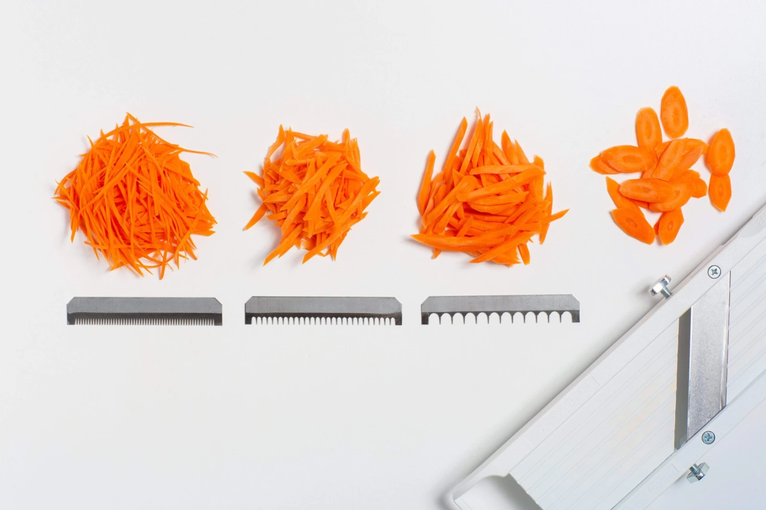 A mandoline vegetable slicer by Japanese company Benriner is standard equipment in most Japanese homes and restaurant kitchens around the world. We prefer this tool’s simplicity, durability and efficacy over other more complicated models. It comes with three interchangeable blades: The fixed straight blade—which is also removable and replaceable, ensuring long-term durability—creates slices ranging from .5 mm to 5 mm. Use the dial on the underside of the mandoline to fine-tune and adjust the thickness of your slices. You can also screw in one of other two blades, which allow you to julienne or finely shred your vegetables. We especially love that the finger guard, which extends across the width of the entire blade, is easy to handle and keeps a firm grip on ingredients while slicing. Additionally, a non-skid base, safety handle and notches in the mandoline will keep the device steady whether you lay it across a bowl or prop it against a countertop.