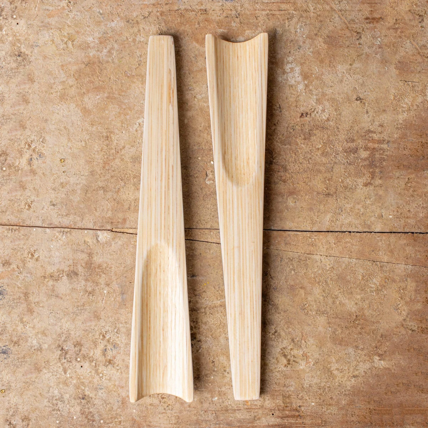 Made only with sustainably sourced bamboo from the forests of Vietnam and other all-natural materials, these sleek salad servers have a long reach and lacquered finish that feels smooth and comfortable to hold. Subtle grooves in the utensils help scoop up smaller salad components like nuts or cheeses, while the minimal design echoes the bamboo’s natural structure and sleek wood grain. Each handcrafted piece is finished with a food-safe varnish that makes it easy to clean and protects the porous material from staining or absorbing off-flavors.
