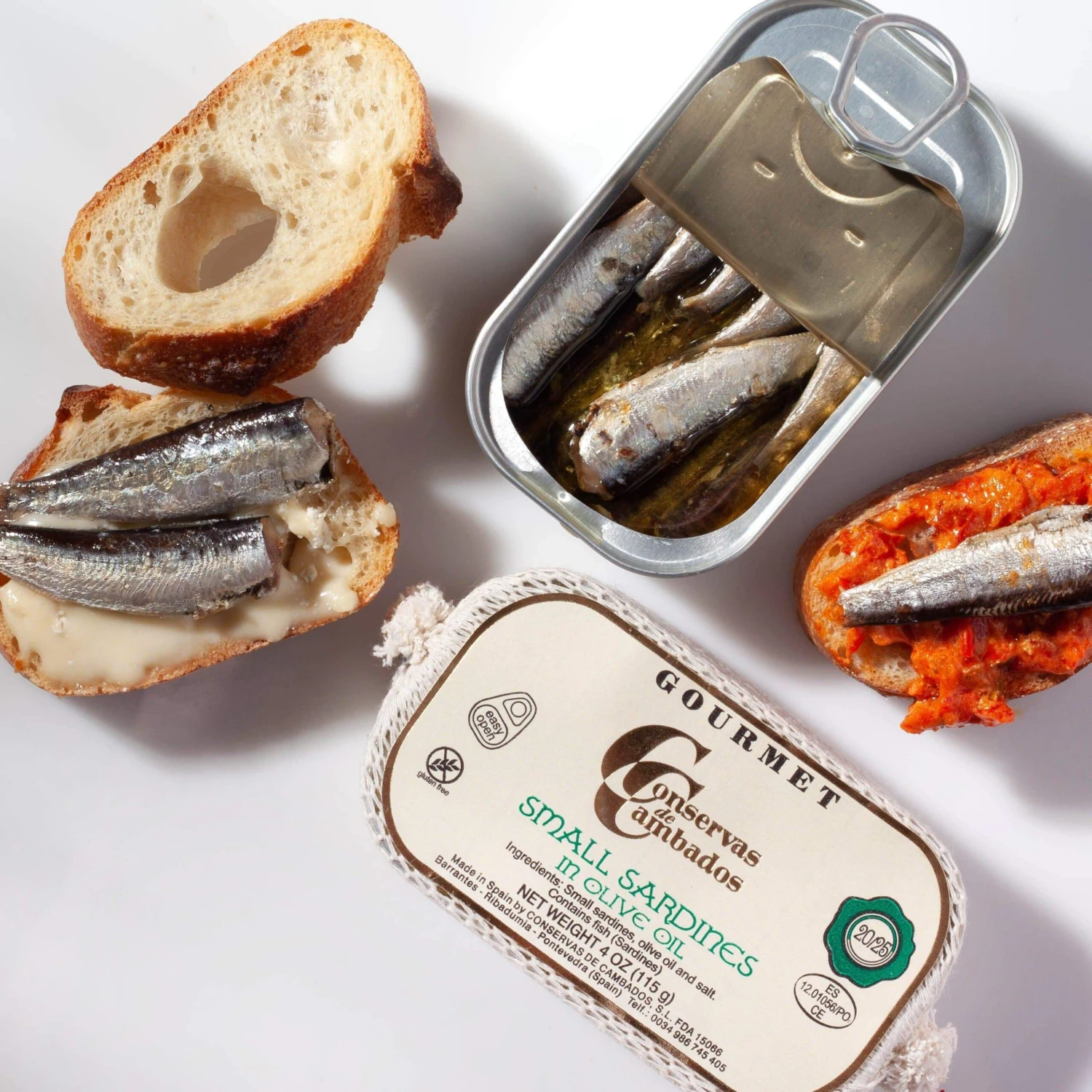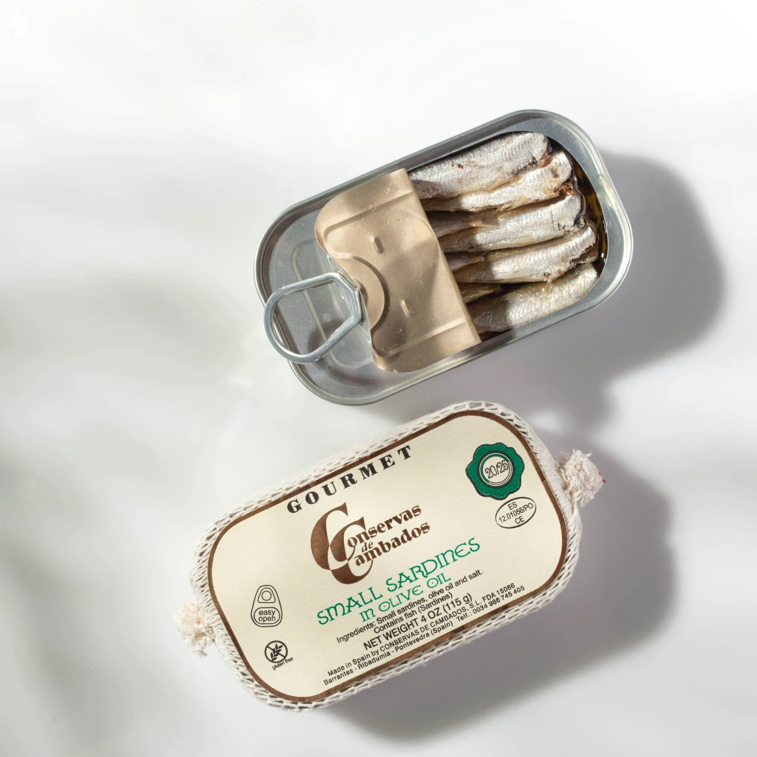 Place of Origin: Spain[/accordions-break]We could tell these sardines were special the second we cracked the tin.[/banner_heading]With shockingly silver skins and delicate, pale flesh, these fish get more flavorful with time, as they’re aged with precision at Conservas De Cambados’ facility to absorb the richness of their olive oil marinade.[/banner-text-break]We love using tinned fish for a lovely light meal and these sardines are no exception. Serve simply atop toast or crackers, or a charcuterie board laden with nutty aged cheeses, bold chorizo or cured ham, fresh or dried fruit and other meaty bites. They’re also a great compliment to our Spanish Grilled Vegetables (Escalivada) or a leafy salad like our Celery and Frisée Salad (Amanida d’Api). The sardines also flavor rice dishes well and can serve as a milder substitute for anchovy fillets. And incorporating them into a rich and creamy spread is always a hit: Mash them up with cream cheese, butter, lemon juice, salt and fresh herbs like parsley or scallions and slather on a toasted bagel or crusty bread.[/how-to-use-break]Like shrimp, these sardines are classified on their tins by size: 20/25, which is the approximate number of sardines per pound. Tip: Warming your tinned fish before eating wakes up some of the flavors. Simply remove the outer packaging and open the can a small crack (to allow for building pressure to escape) and put them, tin and all, in a low oven to heat.