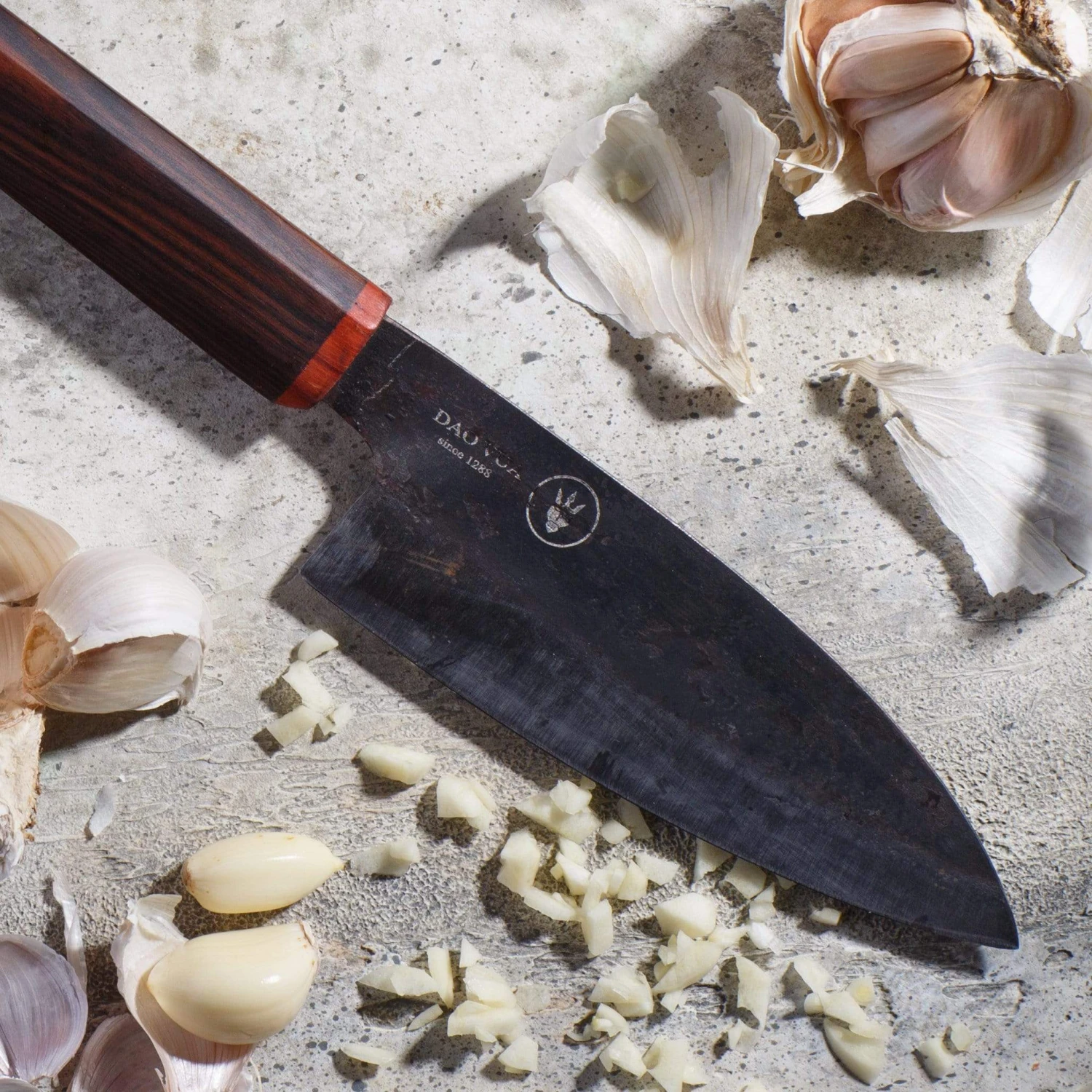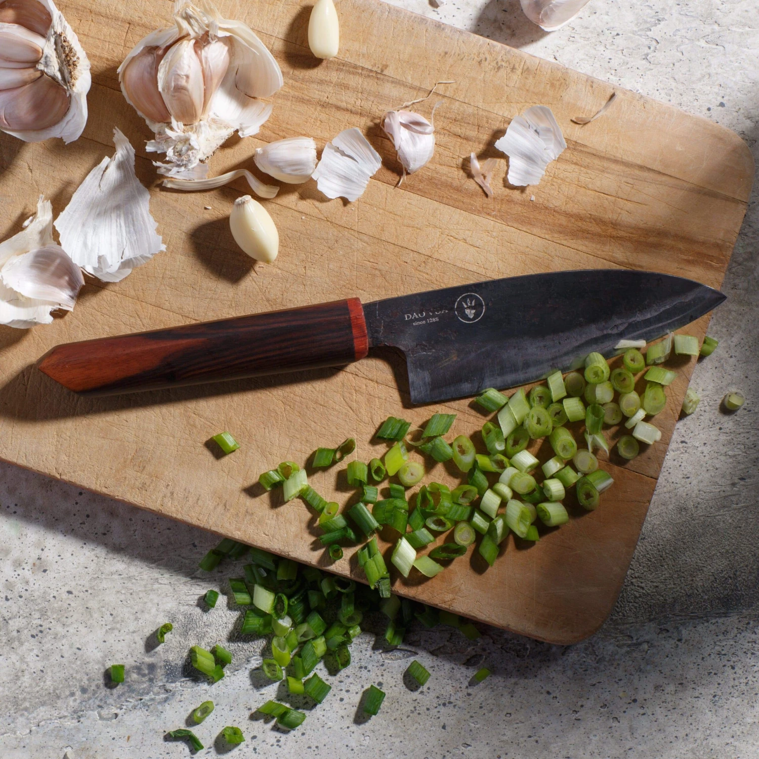 We strongly recommend buying the camellia oil with this knife.[/accordions-break]Affordable, artisan-made knives forged from recycled steel.[/banner_heading]Dao Vua knives are carefully crafted from upcycled leaf spring steel (5160 steel)—a high carbon, chromium-laced steel designed for car springs that happens to be excellent for heavily used knives that need to withstand frequent sharpening and maintain a durable edge. The blades are hardened to 59-60 HRC, so they’ll keep a fine edge with little maintenance. And the blades exhibit all the marks of hand-forging. Plus, they’re finished with a matte black kurouchi (blacksmith) finish, which makes the knives nonstick and protects the steel from moisture. And the comfortable wooden handles are hand-shaped from water-resistant ebony and are similar to Japanese wa handles. With their ergonomic fit, they suit a wide range of hand sizes and cutting styles: choke up for control and slide your grip back for leverage. [/banner-text-break] NOTE: Because of the handmade nature of the knives, expect imperfections and texture on each blade’s surface. We think it enhances the character and uniqueness of each knife.