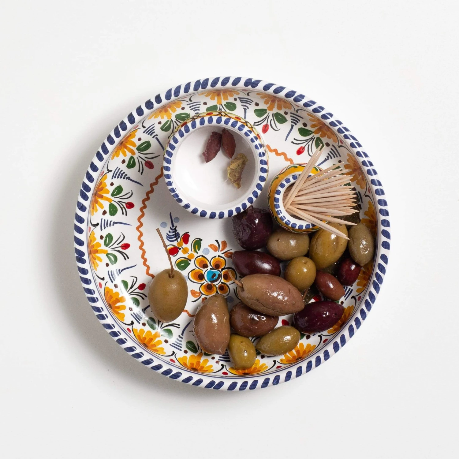 Hand-shaped on a potter’s wheel, this hand-painted olive tray features a thoughtful design with three compartments: one for olives, one for pits and one for toothpicks to spear the olives (both smaller bowls are fixed to the tray). It’s the traditional style of olive dish found throughout Spain and is equal parts beautiful as it is functional.