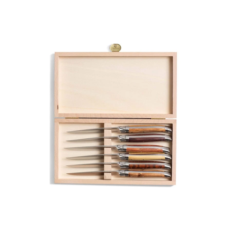 Enjoy beauty and strength with this set of mixed wood avantage steak knives. Unlike the brasserie collection, these knives are forged, with blades made only of X46CR13 stainless steel. Their steel is stronger, with an edge that lasts longer due to a less flexible blade. Plus, the forged steel extends through the handle for balance, making it both comfortable to use and durable. And with no chiseling on the back of each piece, the beauty of the lines and materials simply shines.