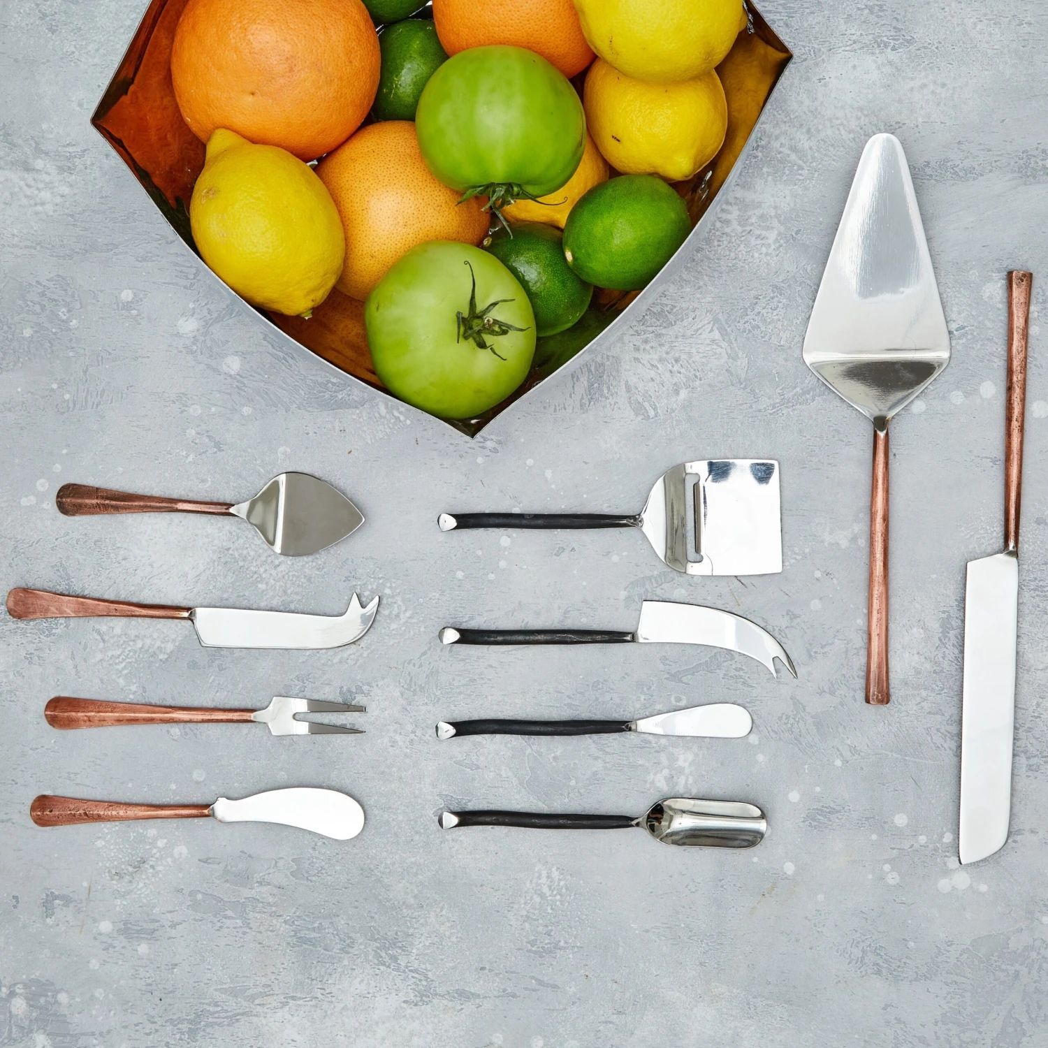 This set of four cheese knives from INOX Artisans pairs durable stainless steel blades with antique copper handles, for hand-forged tools that are rustic, elegant and functional. The set of 4 cheese tools includes a flat cheese knife, cheese spreader, pronged cheese knife and cheese fork, with handles that lie flat (so the tools won’t roll around on a cheese plate or board). A small notch at the end of each handle makes the cheese tools extra easy to grip and use.