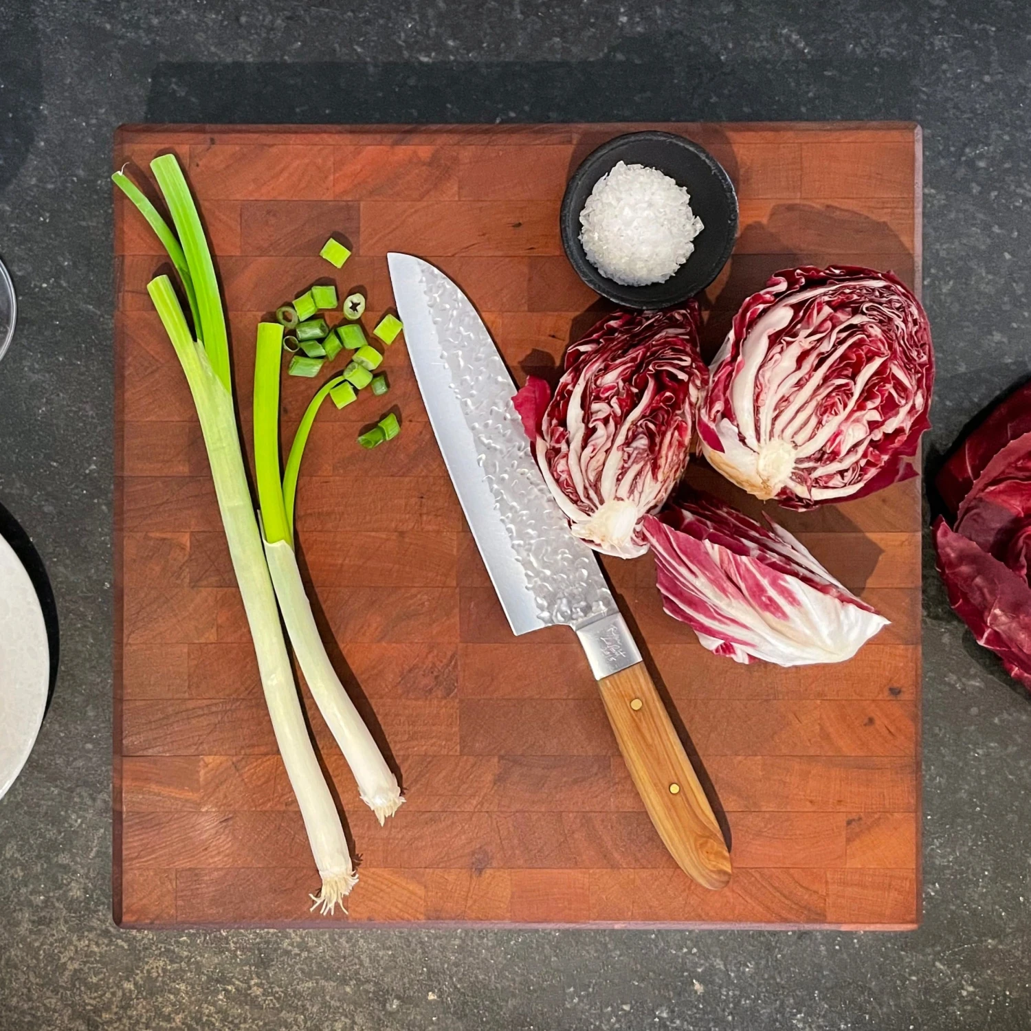 Made from cherry finished with mineral oil and beeswax, this board boasts a sleek design perfect for a professional or home kitchen. The end grain construction is favored, by professional chefs, for its ability to maintain the sharpness of a knife’s blade. The cherry wood will deepen in color over time with a beautiful patina. [/description-break]Specifications [/title]Weight: 13 pounds