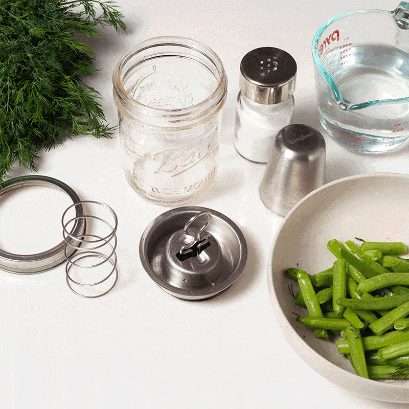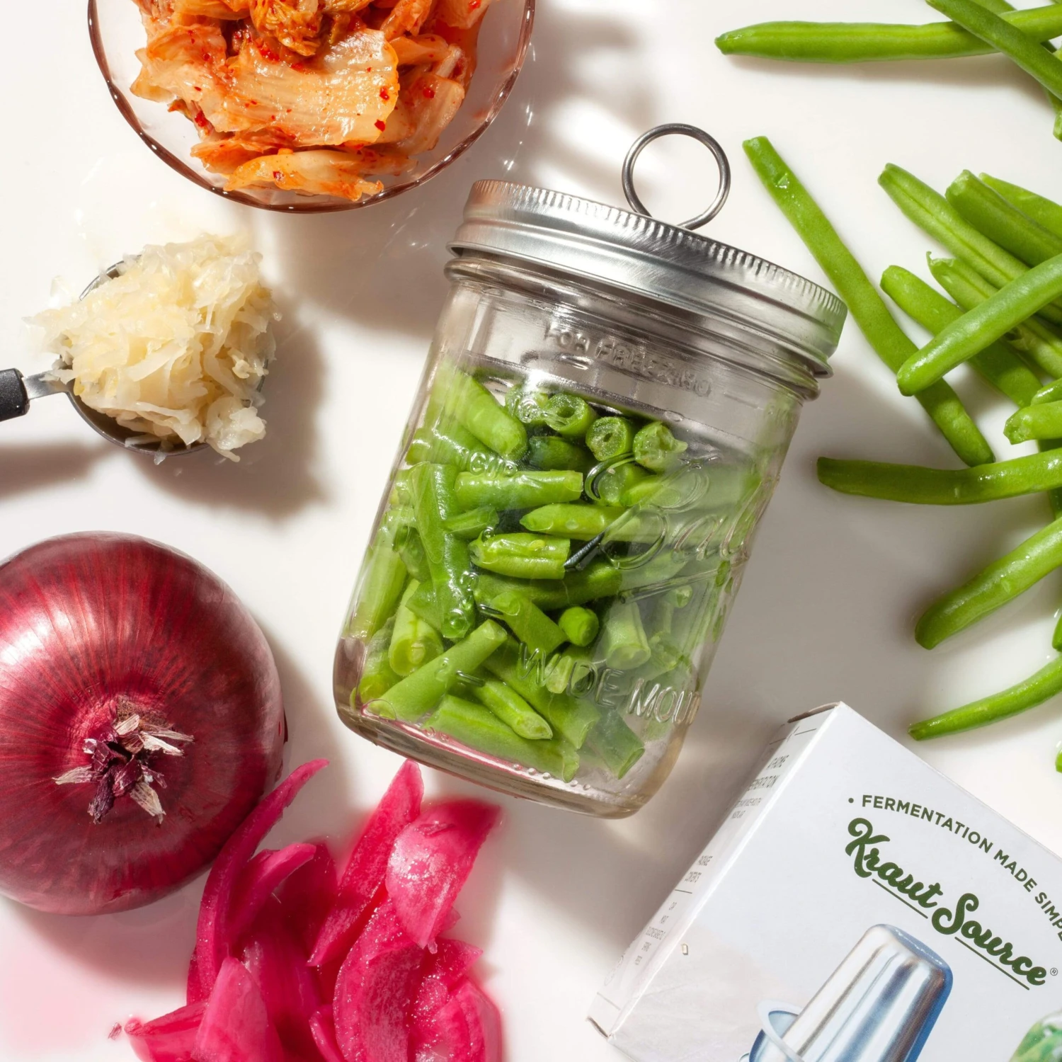 [/description-break] Specifications [/title]Materials: Stainless steel[/accordion] Care and Use [/title]Care: Dishwasher safe[/accordions-break]Only compatible with a wide-mouth canning jar. Use to make homemade pickles, kimchi, sauerkraut and more. After packing your prepped vegetables into your jar, you top with the assembled krautsource lid and screw on tight with the jar’s lid ring. You then turn the metal loop on the kraut source lid, which unlocks the metal press inside the jar. A spring presses the flat metal disk onto the surface of the veggies, making sure they stay submerged in the brine. The “moat” at the top of the kraut source lid is filled with water and then the giant thimble-shaped cup is placed over the hole, with the bottom rim submerged in the “moat.” This allows gasses out (they can escape up through the top, through the water) but keeps airborn nasties out. Without this style of topper, you need to let the gases out of your jar regularly to prevent pressure from building up inside. (you do need to peek at it to make sure the water level doesn’t drop due to evaporation)[/how-to-use-break]A mason jar is _not_ included with this product. A jar with wide-mouth opening (diameter of 86 mm) is required to work with Kraut Source. You will also need the ring that came with your jar to attach the lid.