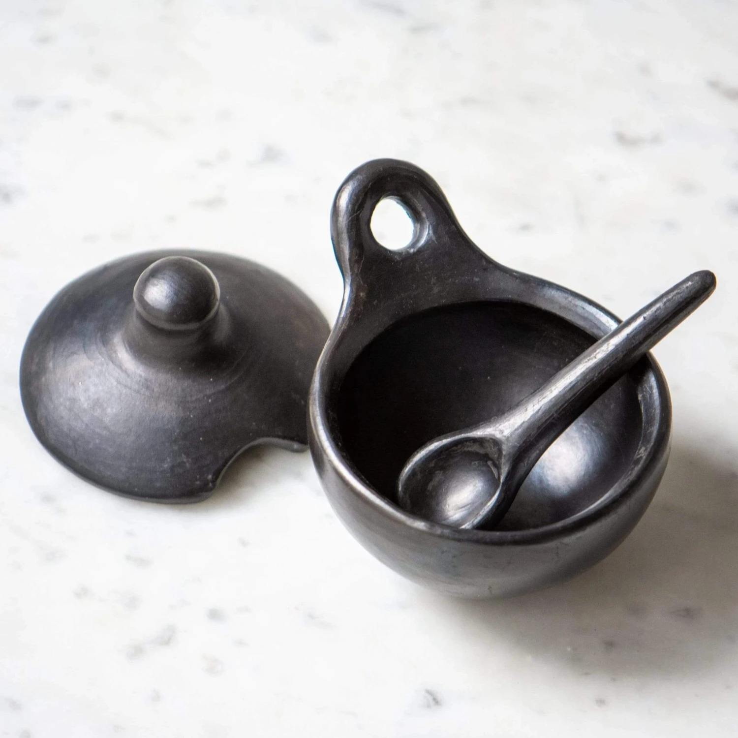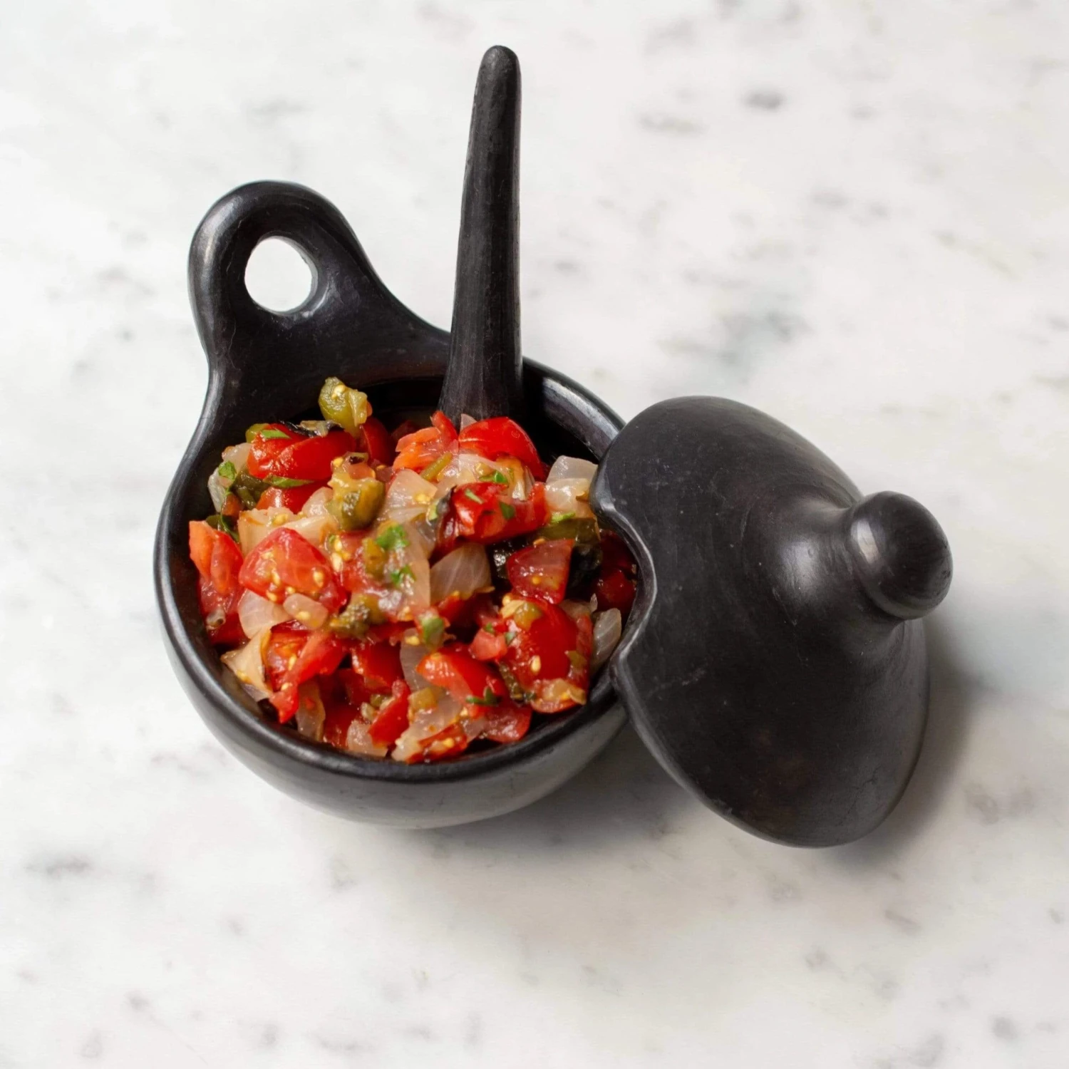 Named for its place of origin, La Chamba clay cookware from Colombia is crafted completely by hand using centuries-old methods. Made from local river clay, the stunning matte-black surface of this salsa dish looks similar to cast iron but is much more lightweight and easier to handle. It also adds a beautiful authentic accent to your table. The handcrafted lid is perfect for keeping your condiments covered until the moment you need them, especially when cooking outdoors—we love the look of La Chamba as part of an outdoor barbecue spread. Use it to serve our Colombian Avocado Salsa (Áji de Aguacate) or our Green Chili and Tomatillo Hot Sauce. Making La Chamba cookware is quite literally a community effort, and every piece passes through the hands of various skilled artisans in one village in Colombia. The three types of clay used in the dishes’ construction make them strong enough to use in the oven, microwave or on your stove—but as with all clay cookware, La Chamba pieces should not be exposed to extreme temperature shock.