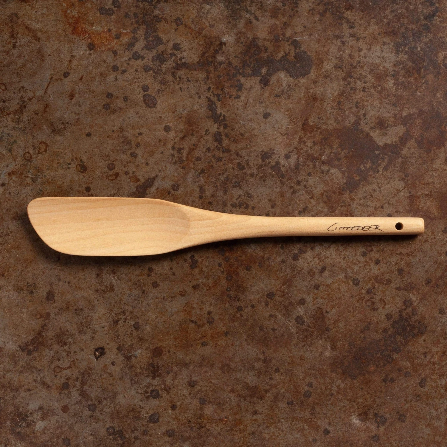 Materials: Maple wood[/accordion] Care and Use [/title]Care: Hand wash only. Do not soak.[/accordions-break] These stunning wooden kitchen tools have a unique backstory. Canadian inventor and designer Tom Littledeer learned the value of craftsmanship from his father, a millwright and blacksmith.[/banner_heading]When tasked with designing a new shape of canoe paddle for Olympic canoeists in the mid 1980s, he also unintentionally created his first wooden cooking utensil: the pot scoop. Now he makes a series of beautiful kitchen tool from hard, heat-enduring maple wood.[/banner-text-break]Use this tool to get every last bit of sauce from your pot, mix batters and doughs, and more.[/how-to-use-break] The wood used is very “thirsty.” After washing, the wood will start to feel less smooth than when brand new. The slightly rough texture means it’s in need of an oiling. Oiling wooden tools is part of the normal and proper maintenance routine and prevents warping, cracking and splintering.