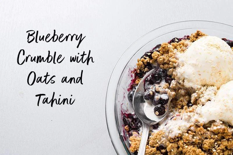 Blueberry Crumble with Oats and Tahini: Blueberries are tossed with oats and sugar and then topped with a crumble of oats, tahini, cinnamon, sugar and butter, Baked in a pie plate for half an hour—big flavor with little work.[/banner-text-break]