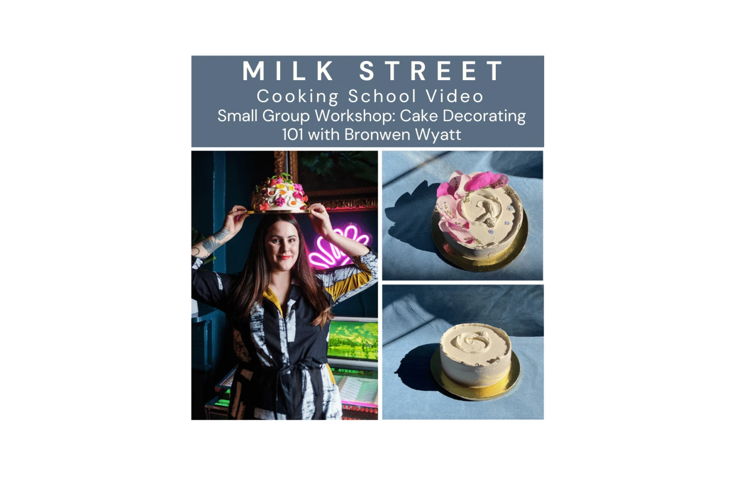What’s Included[/title] You will receive a .zip file that includes the cooking school video as well as PDFs of the recipe instructions.[/accordion] How to Download[/title] After you purchase your Milk Street Cooking School Video, you will receive an email from the Milk Street Store with the subject line “Your Cooking School Video is Ready for Download.” Within this email there is a link that will direct you to a download page, click download now to download the .zip folder. To unzip the folder, double-click the zipped folder to open it. Please note: your video download file will have an approximate size of 500 MB. [/accordions-break] Bronwen Wyatt is a pastry chef and owner of Bayou Saint Cake. [/banner_heading] Known for her whimsical layer cakes garnished with edible flowers, Wyatt is constantly inspired by the Louisiana seasons, using local produce to create inventive, contemporary sweets. She lives with her wife and two cats in a 100-year old house in New Orleans. [/banner-text-break]