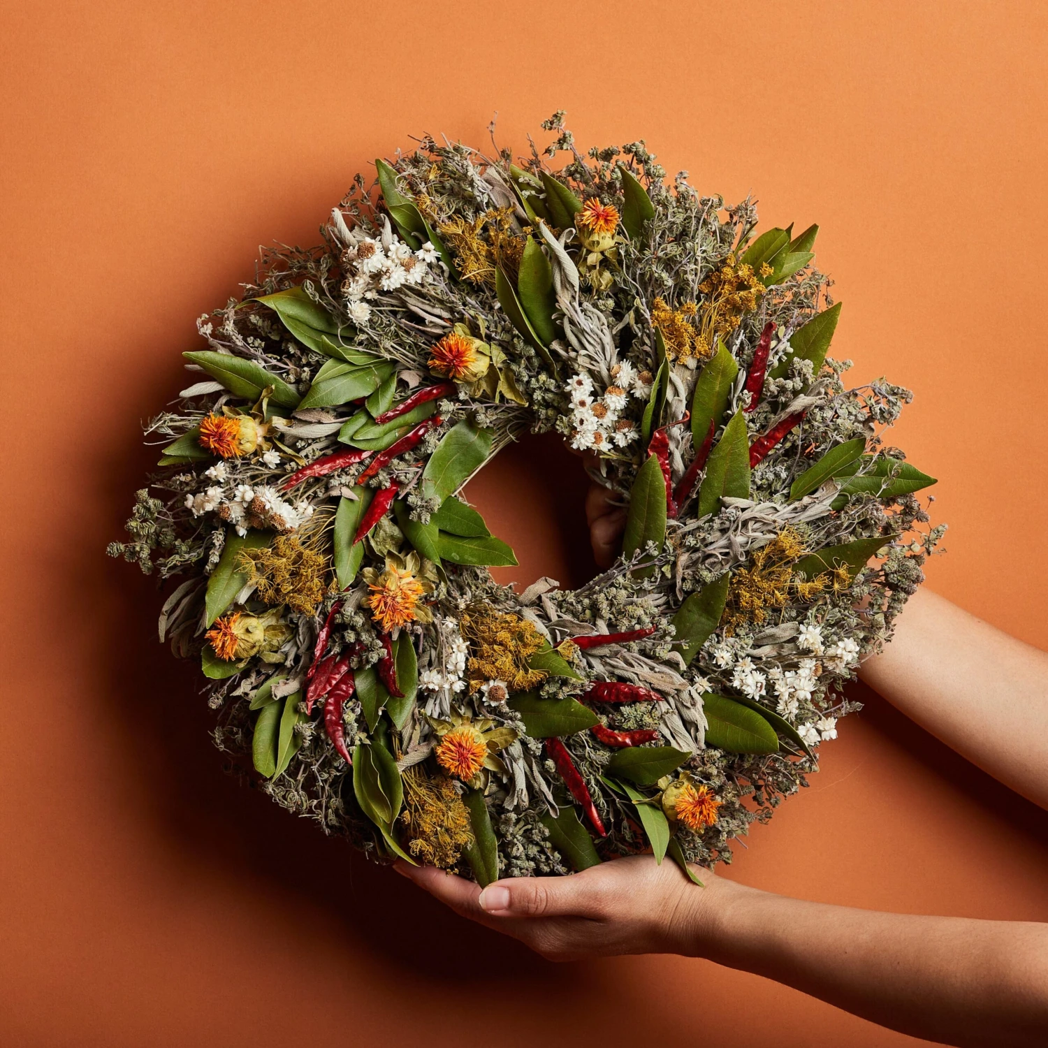 [/description-break] Ingredients [/title] Ingredients: Bay leaves, Savory, Marjoram, Sage, Strafflowers, Chilis, Dill, Ammobium Flowers [/accordion] Specifications [/title]Dimensions: 15 inch DiameterPlace of Origin: California[/accordion]Use & Care [/title]Use: Hang indoors, out of direct sunlight, and away from excess heat or moisture. Once dried, wreaths will last between six months to a year.