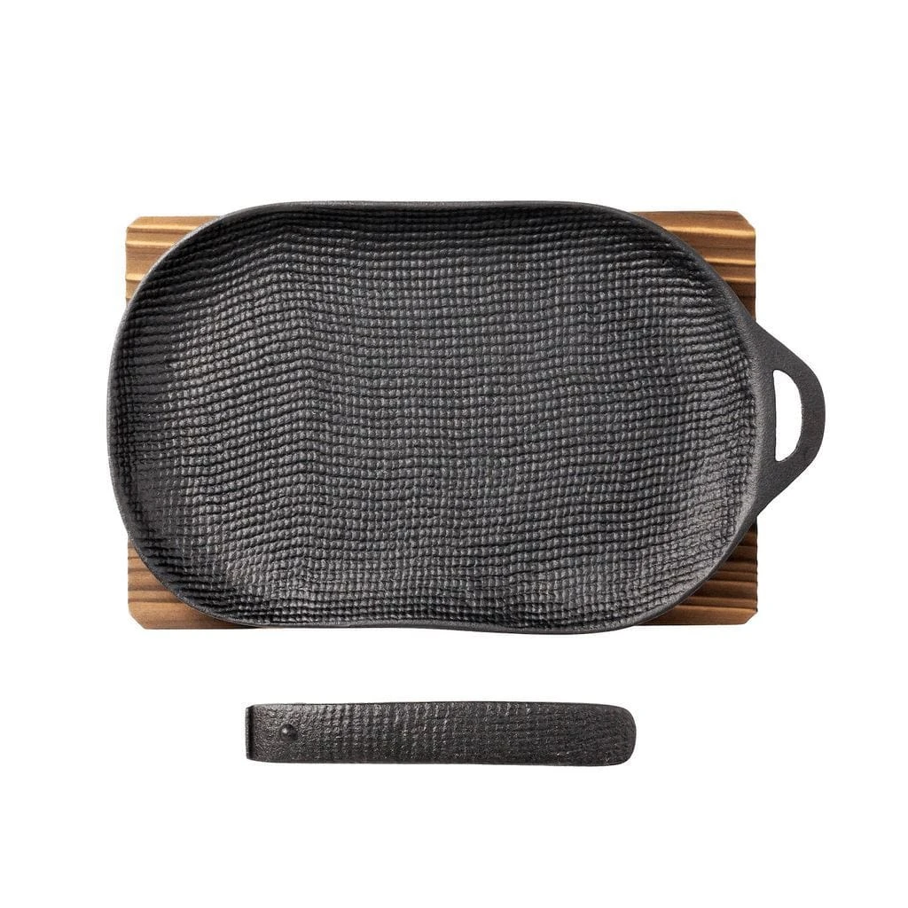 Includes: Cast iron grill pan, detachable cast iron handle and a cedar trivet included[/accordion] Care and Use [/title]Care: Hand-wash with hot water, using sparingly if needed. Do not soak. Dry thoroughly, preferably on the stovetop. Brush forming rust away with a brush and wash normally. Able to be used on stovetop.