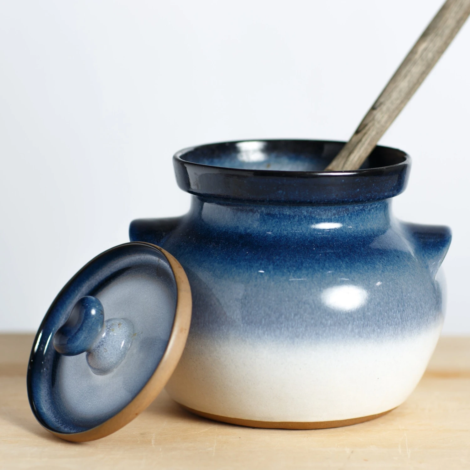 Place of Origin: West Kingston, Rhode Island[/accordion] Care and Use [/title]Care: Safe to put in the oven and dishwasher. Do not use on the stovetop; the uneven heat can cause thermal shock. [/accordions-break]If English settlers had their way, New England baked beans would have been made with peas. [/banner_heading] But the pea seeds they packed originally to make stew with salted meat wouldn’t grow in the new environment, so indigenous beans became the replacement. The Puritans were not allowed to cook after sundown on the Sabbath, so beans were cooked all day on Saturday so they could be eaten that evening and into Sunday. Savory baked beans were common until the mid 1800s when molasses began to be added, and that version has since taken hold as the classic New England recipe.[/banner-text-break]This bean pot can be used for any recipe that requires the beans to be cooked from their dried form, for a long period at a low temperature. [/how-to-use-break]Safe to put in the oven and dishwasher. Do not use on the stovetop; the uneven heat can cause thermal shock.