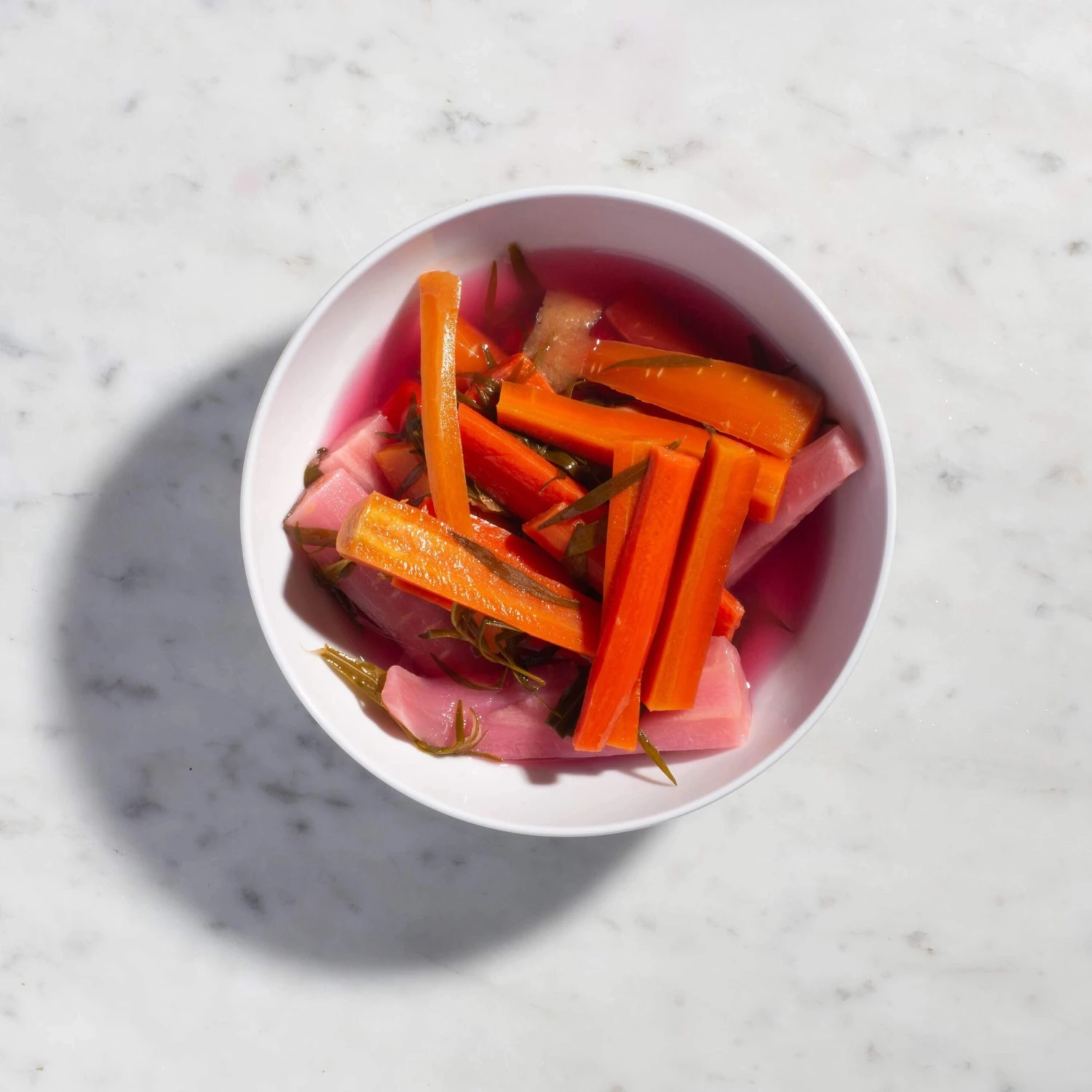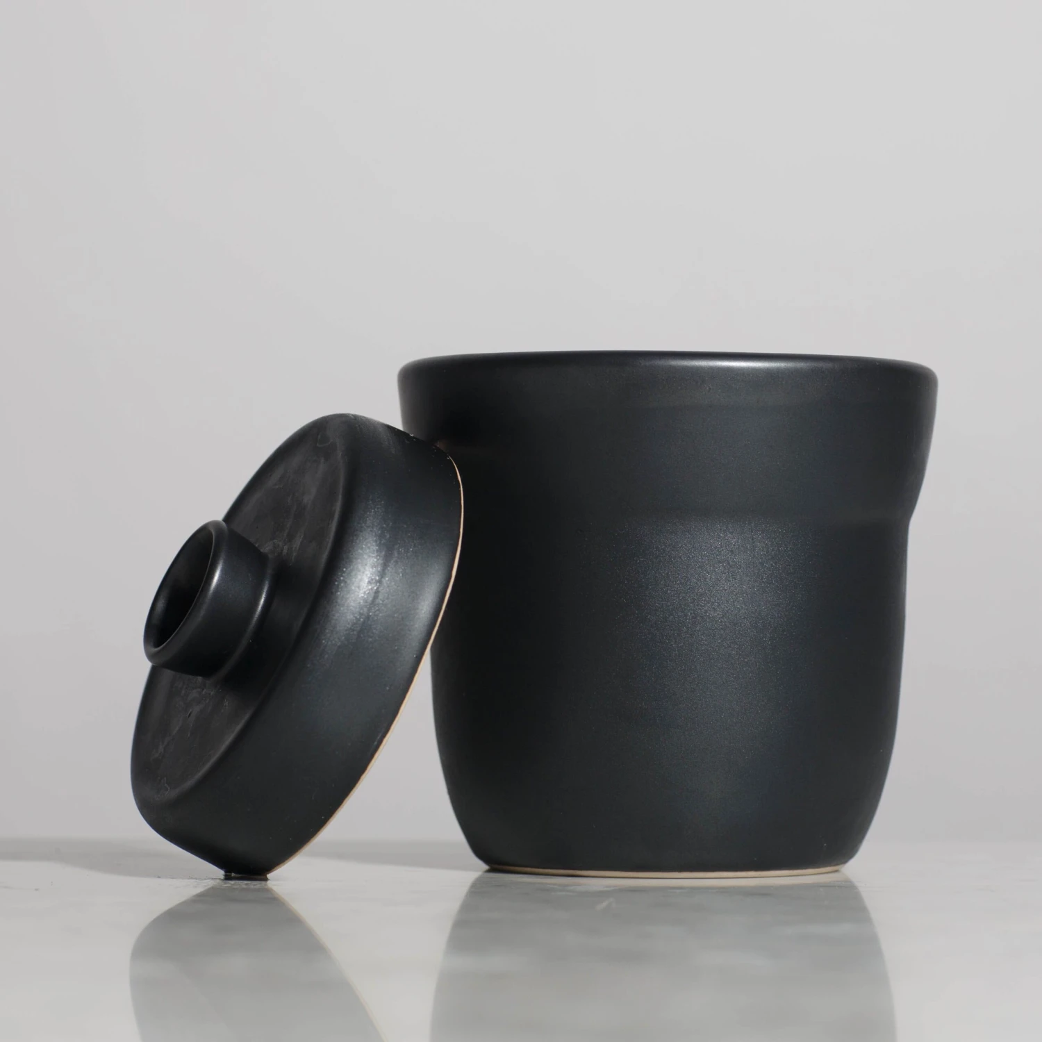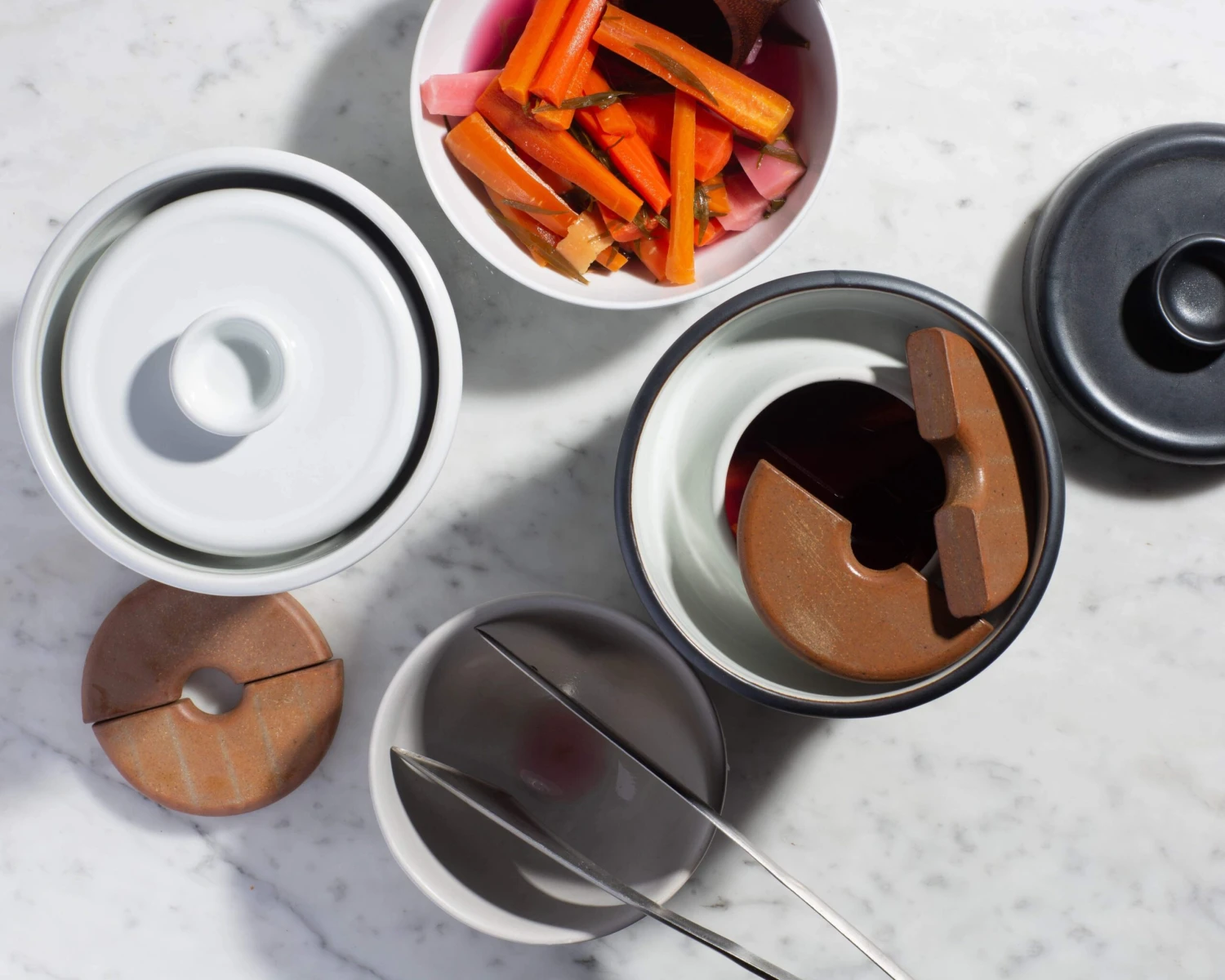 Care: Hand wash only. [/accordions-break]Sarah Kersten might take years to design a piece of pottery.[/banner_heading]She makes sure every element is perfect before hand-making and hand-glazing her pieces. Her designs are often inspired by what her chef friends need in the kitchen. [/banner-text-break]To use, prepare and pack vegetables inside the jar, then fill the channel at the jar’s mouth with water. Once the lid is placed into the water, fermentation begins, creating CO2, which in turn pushes oxygen out of the seal and maintains an oxygen-free ferment. [/how-to-use-break]Hand wash only.