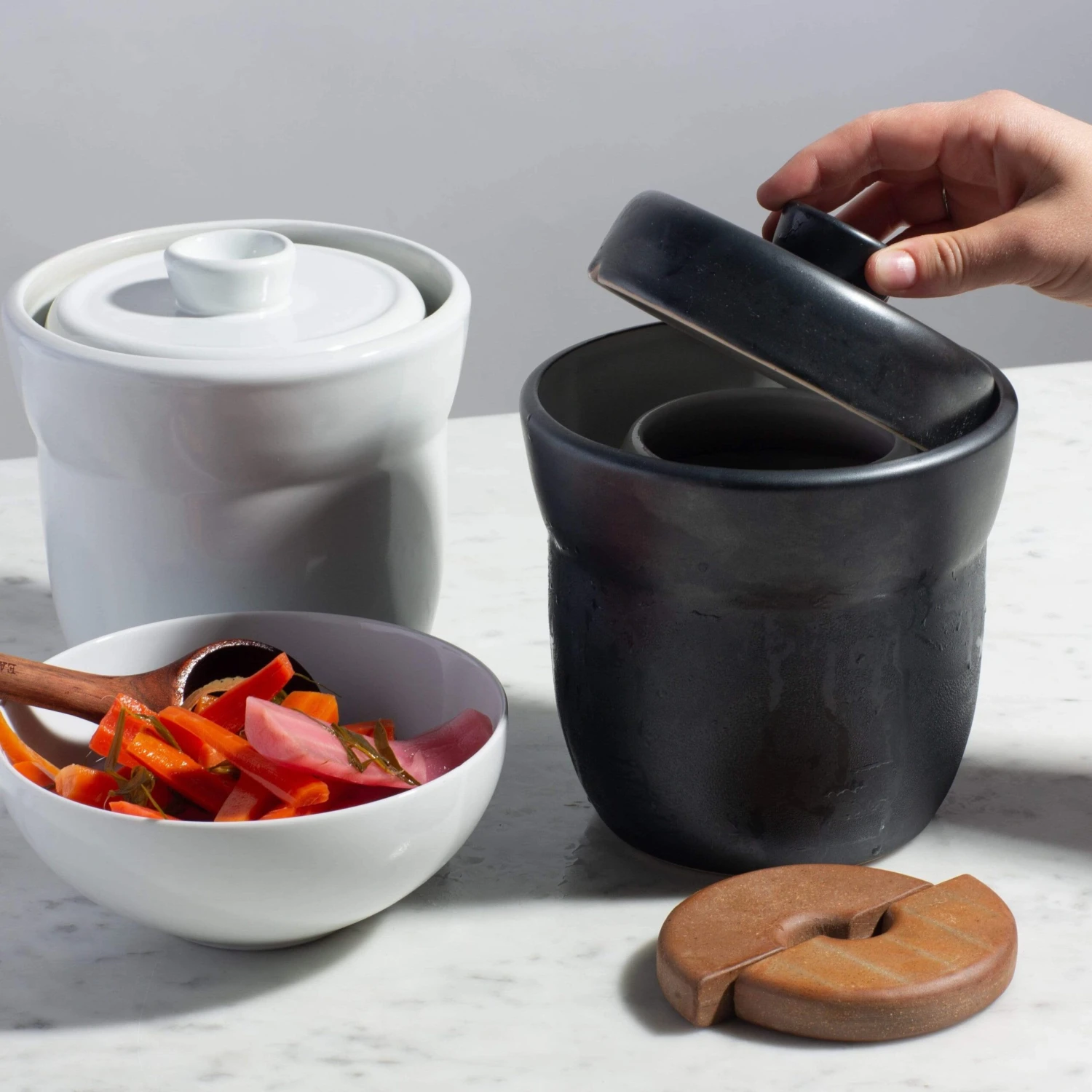 Handmade in a small Oakland, California studio, this fermentation jug is elegant, functional and compact enough for apartment kitchens. It’s rustic, minimalist aesthetic will be at home on any countertop—made from high-fired stoneware and finished with a hand-made glaze in a glossy, speckled white or silvery, matte black. We also love how the crock uses a traditional water-lock style seal, an ancient fermentation style which does wonders to keep out oxygen. After a water-sealed crock is packed, two half-circle weights (which are included) are placed into the crock to keep your veggies submerged. Then, the lid is placed into an open moat which is then filled with water. Now, outside air is prevented from entering the crock and carbon dioxide gases created during fermentation easily bubble out.