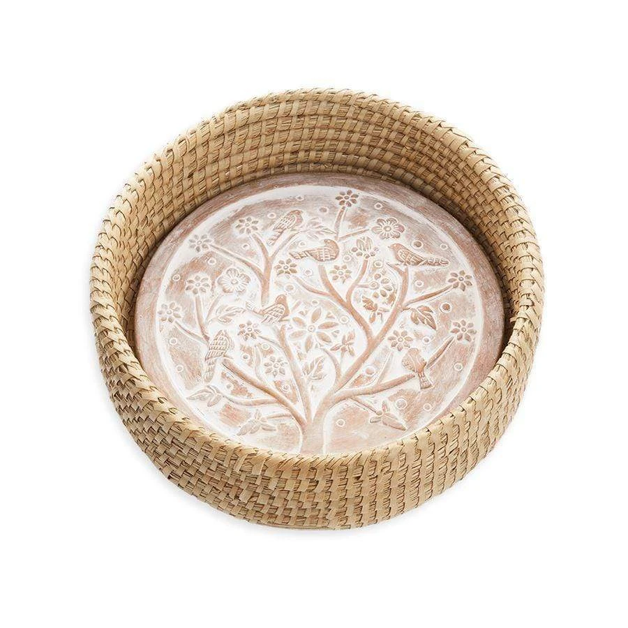 Materials: Terracotta stone, palm, kaia grass [/accordion] Care and Use [/title] Use: Not dishwasher safe; rinse with water.[/accordions-break]This breadwarmer is carefully crafted by women artisans in Bangladesh.[/banner_heading]And since 1981, this company has provided these women a fair wage, access to healthcare, education for their children and more benefits through this partnership.[/banner-text-break]Rinse before first use. Dry well. Preheat oven to 350°F. Place terracotta stone in oven and bake for 10 minutes. Do not put basket in oven. Handling carefully, place stone in basket. For best results, wrap food in towel and place on warmer. To clean, rinse with water.[/how-to-use-break]Not dishwasher safe. We recommend wrapping bread with a napkin or tea towel before placing onto the terracotta stone. The terracotta is food safe, this is just a better way to keep your bread warm and keep the terracotta clean.