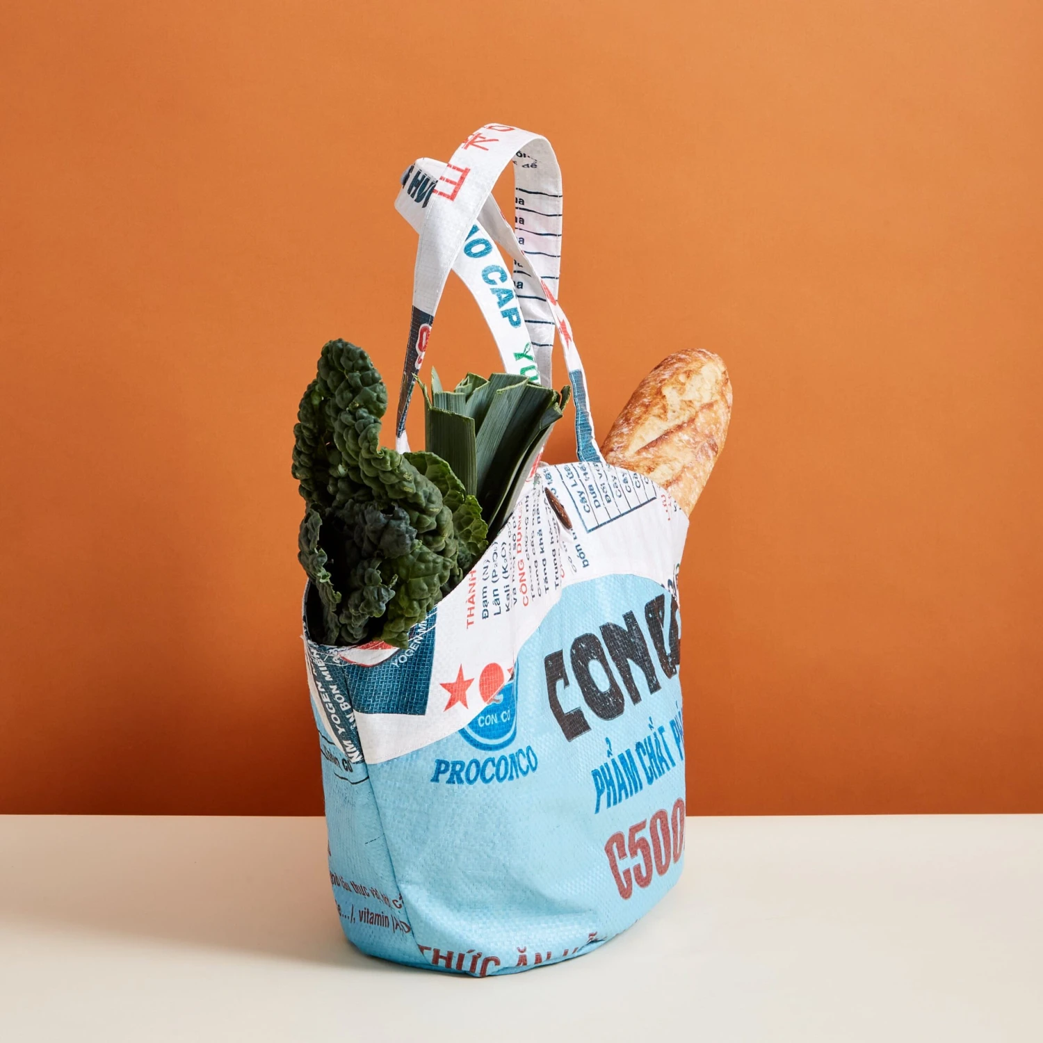 These unique reusable market totes from Serrv International are handmade in Vietnam from a double layer of recycled feed bags—an incredibly sturdy material. A coconut button closure keeps the tote closed and protects groceries from the elements, and cleaning up is a snap—simply wipe the woven plastic clean with a damp cloth. Due to the one-of-a-kind nature of each bag, colors and patterns may vary from what is pictured.
