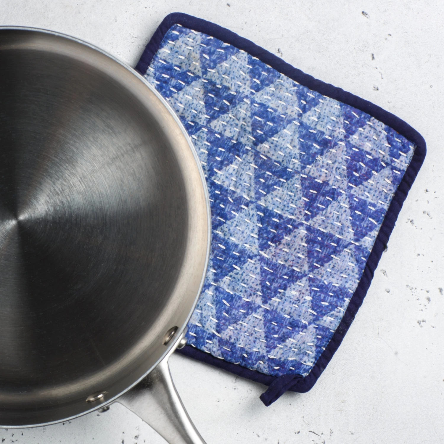 This beautiful hand-stitched pot holder featuring traditional Indian kantha stitching on an upcycled vintage cotton sari is a completely unique kitchen accessory. The needlework is based on an ancient art craft that gave new life to old cloth by upcycling and repurposing various fabrics and textiles. We love their sustainability along with their appealing form and function. The quilted insulation helps protect hands from heat and a hanging loop is attached for easy use and storage. Best of all, they come in a wide array of colors and patterns, with no two alike. These high-quality vibrant pot holders are unlikely to fade with use, as they’ve already been pre-washed to ensure their rich colors stay true. Please note, all of our kantha items are one-of-a-kind, thus the item recevied may not match the image shown.