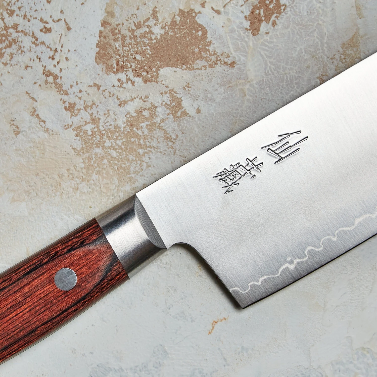 Suncraft’s modernized 7-inch nakiri takes the classic Japanese blade’s typical rectangular shape and adds a soft, pointed tip for a uniquely useful knife. The blade’s geometry is more arced than a traditional nakiri, which makes it adept at mincing and rock chopping. Despite the curving blade, it retains a nearly consistent broad blade to the tip for finger safety and the ability to scoop chopped foods up to transfer to the mixing bowl or hot skillet. Suncraft’s classically styled “Senzo” line of knives feature AUS-10 steel blade, a tried-and-true knife steel that holds an edge well, is easy to tune up and is highly resistant to corrosion (though as with any knife, should be dried after use). The western-style handles are fashioned from pakkawood, a traditional handle material of wood stabilized with resins, which makes them impervious to water.