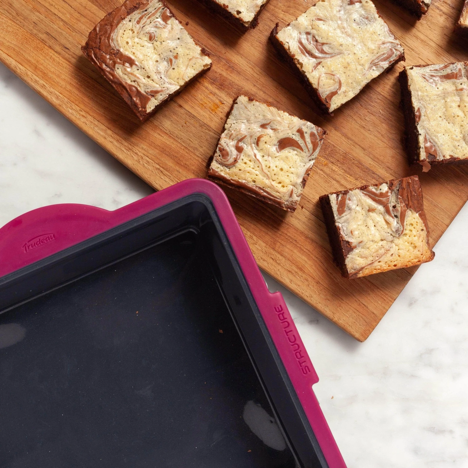 Materials: Silicone, steel[/accordion] Care and Use [/title] Oven safe up to 428°F/220°C, freezer safe and dishwasher safe. Do not microwave.[/accordions-break]Not only does Trudeau use top-notch silicone, but the producer also integrated a sturdy steel frame that gives it much more structure than other brands of bakeware. [/banner_heading]It won’t flop going in and out of the oven or as you fill it—so there won’t be any crying over spilt batter.[/banner-text-break]Use to make our Tahini Swirl Brownies (square) or our Tangerine Almond Cake with Bay-Infused Syrup (round).[/how-to-use-break]Oven safe up to 428°F/220°C, freezer safe and dishwasher safe. Do not microwave.
