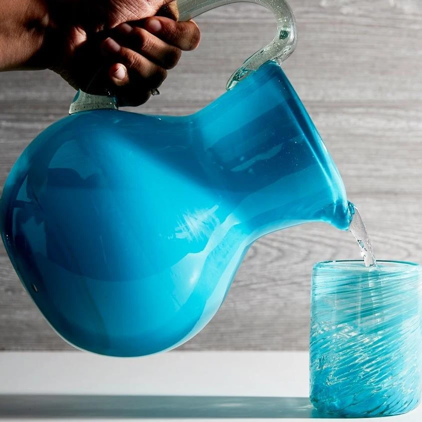 This vibrant aqua-hued pitcher is sustainably made from recycled glass and steeped in Mexican tradition. Each is crafted by a team of artisans in Tonala, Mexico, led by Javier Gutierrez Esponsa, who has been mastering the art of glassblowing for decades—beginning when he saved a glass factory from being demolished at age 22. Although each pitcher has a slightly-different character, as is the case with handmade pieces, all feature a generously sized clear glass handle and large body to hold a large amount of libations like water, iced tea and batch cocktails in style.[/description-break]Specifications[/title]Net Weight: 2.8 liters