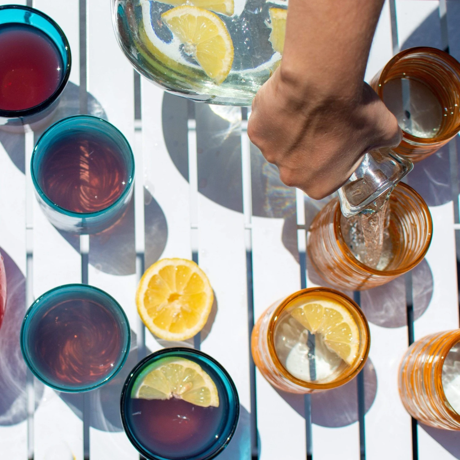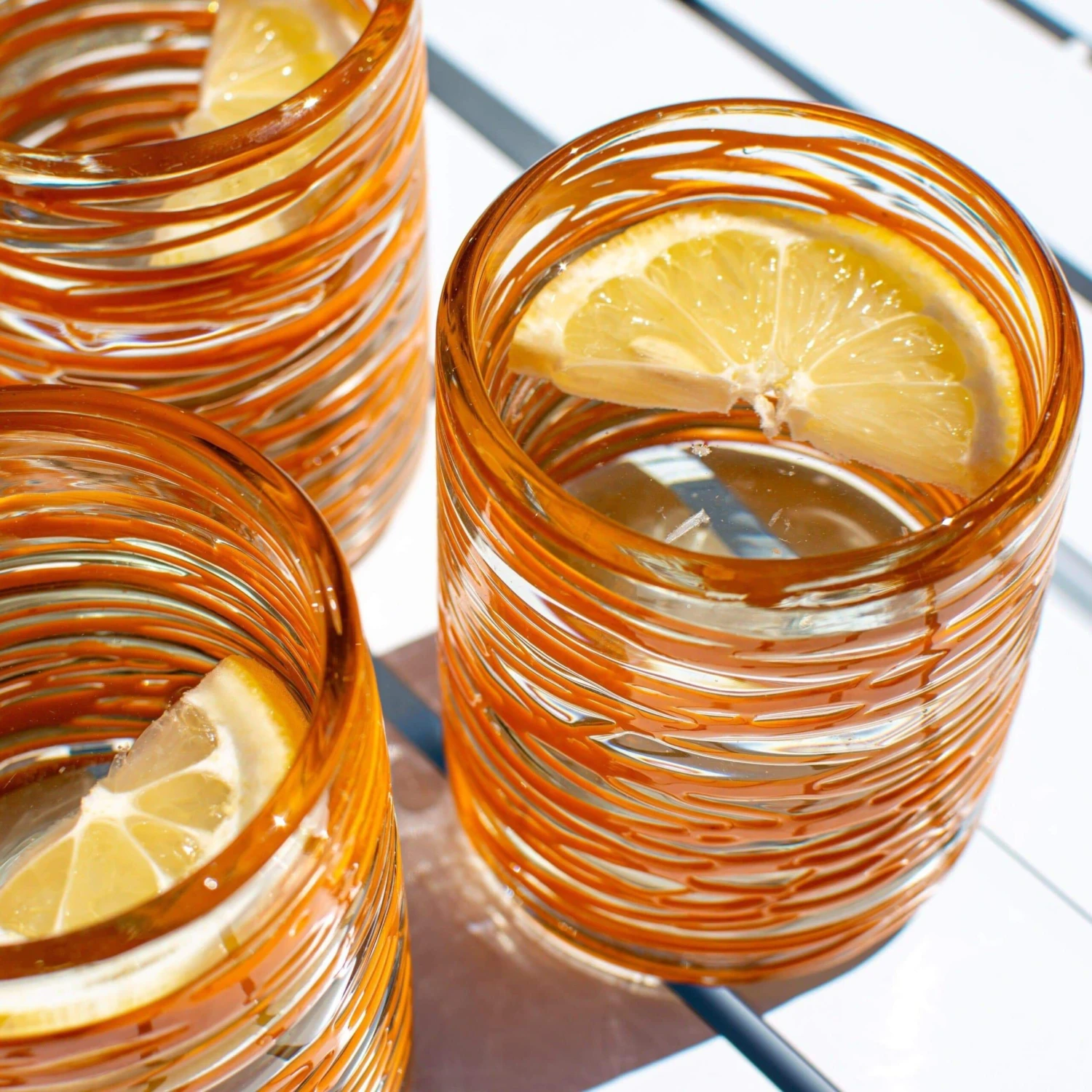 Sip in style with this set of four vibrant tumblers handcrafted from recycled glass by artisans in Mexico. Available in two color variations—one featuring a tangerine-hued spiral design and another including two ocean-like aqua swirl glasses and two blue and white tapered gradient glasses—these tumblers are sturdy enough for everyday use, yet unique enough to still feel special.[/description-break] Specifications [/title]Net Weight: 13 ounces
