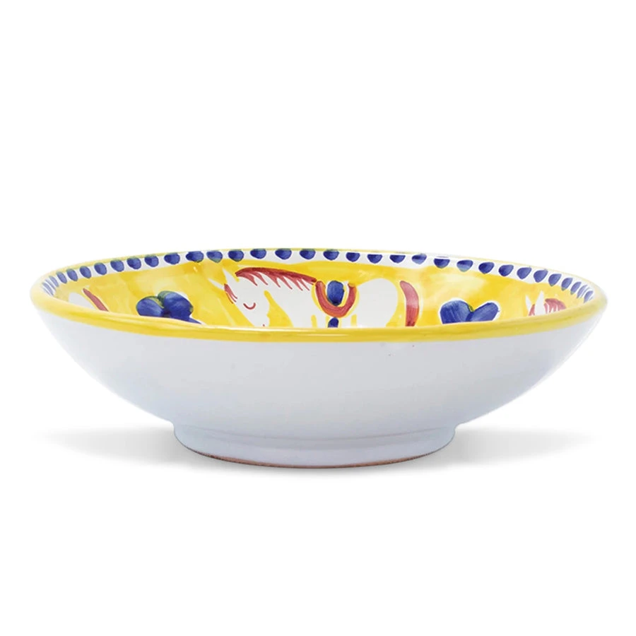 These hand-painted ceramic pasta bowls from Vietri’s flagship Campagna collection are a playful, heirloom-quality addition to any tabletop. Inspired by pastoral southern Italy, every unique piece features a whimsical hand-rendered animal motif. Choose between a horse, rooster, cow, pig, fish or bird, plus vibrant wildflowers or bright coastal algae native to the area. Serve pasta in Vietri’s Large Serving Bowl and dish it up in these mix-and-match, dishwasher-safe bowls. Terracotta, locally sourced from the Amalfi Coast, has been used for Italian ceramics for centuries: the first pieces were dried in the sun. Today, Vietri’s artisans make the Campagna line the same way ceramics have been made for 500 years, but instead of using the sun’s heat to set each piece, each one is fired in a kiln. Careful control of the kiln’s temperature influences each unique piece’s shape and glaze colors. The Campagna line’s cheeky name refers both to the line’s inspiration—“campagna” is Italian for “countryside”—and Vietri’s origins in Campania, a rural, coastal region of southern Italy.