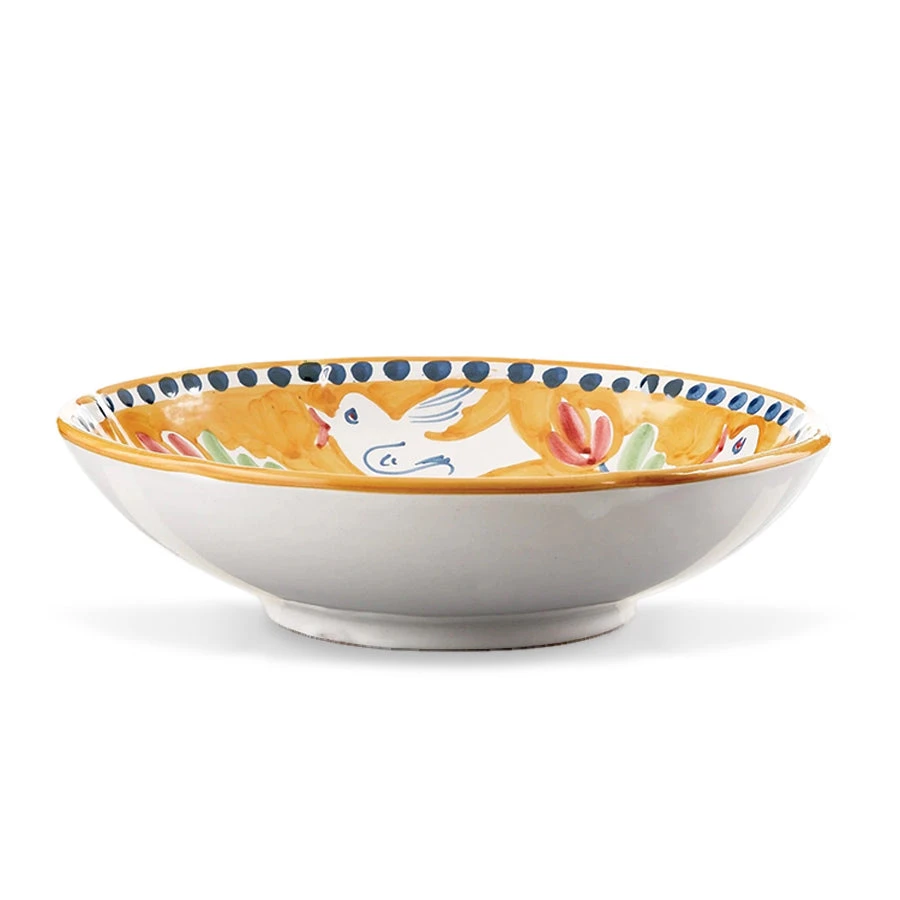 Care: This piece is dishwasher-safe, but wash the Campagna collection in a lightly loaded dishwasher, arranged to avoid touching other dishes, with a nonabrasive, unscented detergent. Dry thoroughly before storing. This piece is also microwave-safe. Natural clays may get hot in the microwave: Always use a pot holder when handling microwaved Campagna dishes and allow them to cool slightly before removing form microwave. Do not place this piece or other Campagna dishes in the microwave without food or liquid.[/accordions-break] The gold standard of terracotta comes from Italy.[/banner_heading] Literally translating to “baked earth” in Italian, terracotta typically refers to red-tinted earthenware made from porous clay. Clay found in Italy, particularly Tuscany, is famously durable and historically was used for utilitarian ends, like roofing tiles or bricks. However, despite being coarser than other clays that are popular for tabletop ceramics (like porcelain), terracotta lends itself well to serveware, taking on glaze and shape beautifully to become heirloom quality platters, bowls and the like. [/banner-text-break] Mix and match your pasta bowls with each unique, whimsical style. Pair these with the Vietri Campagna Collection Large Serving Bowl Platter to serve pasta or soup.[/how-to-use-break]This piece is dishwasher-safe, but wash the Campagna collection in a lightly loaded dishwasher, arranged to avoid touching other dishes, with a nonabrasive, unscented detergent. Dry thoroughly before storing. This piece is also microwave-safe. Natural clays may get hot in the microwave: Always use a pot holder when handling microwaved Campagna dishes and allow them to cool slightly before removing form microwave. Do not place this piece or other Campagna dishes in the microwave without food or liquid.
