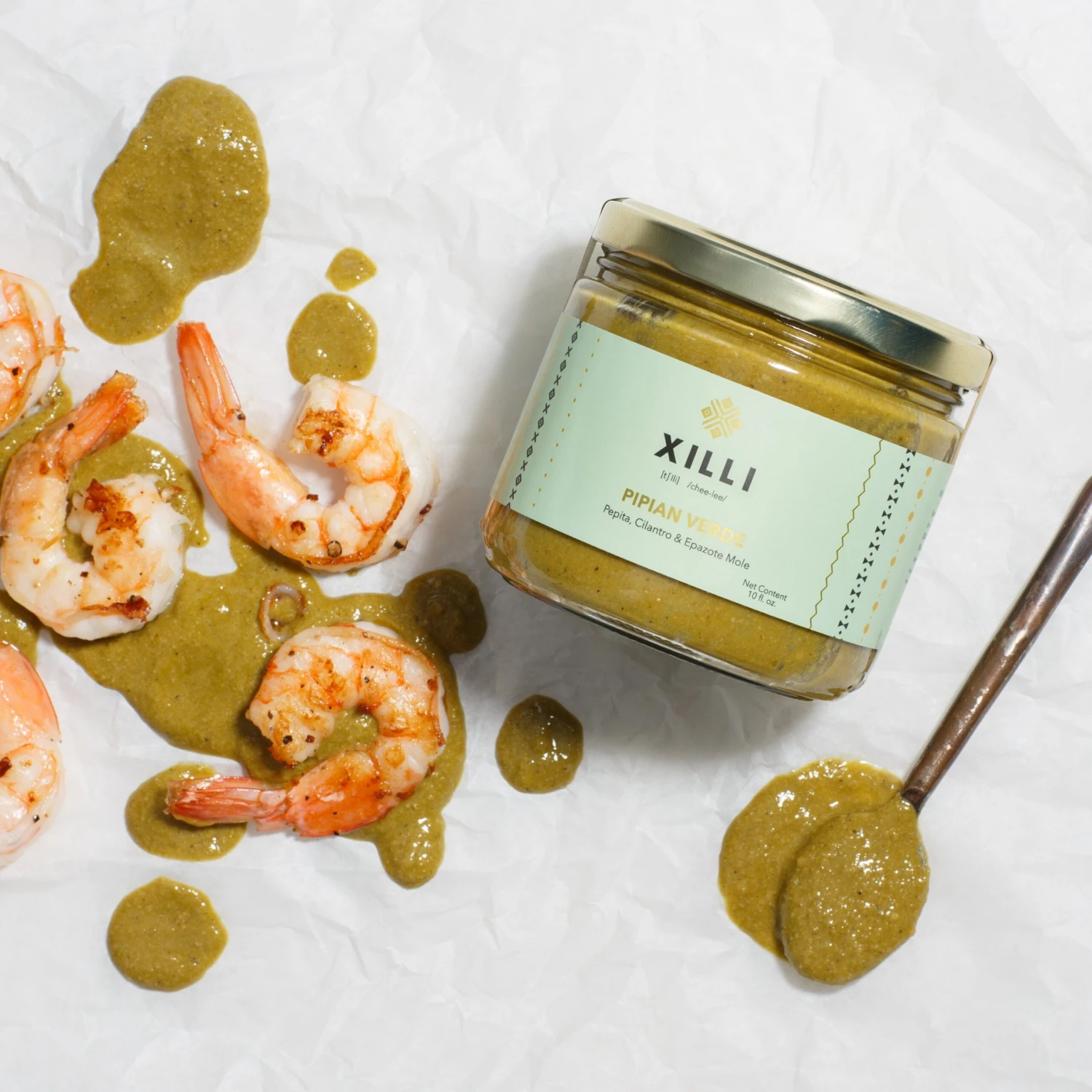 Herbaceous, refreshing and nutty, this classic pipian verde mole from Xilli is made with Mexican herbs and green pepitas. Otherwise known as mole verde, most other versions you’d find come in the form of a paste or powder, with ingredients that aren’t fresh or high-quality. This mole is the real deal, getting its name and nutty flavor from the main ingredient, pumpkin seeds, along with tomatillos and jalepeños that contribute to the earthy green color. The nutty creaminess from the pepitas pairs well with the jalapeños, adding a nice sweetness and aroma without an overpowering heat. The fresh herbs in this mole add a refreshing and acidic sweetness, almost reminiscent of a sour green apple. Add this mole to rice or enchiladas, pour and simmer over the protein of your choice or use as a dipping sauce.